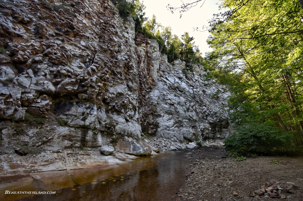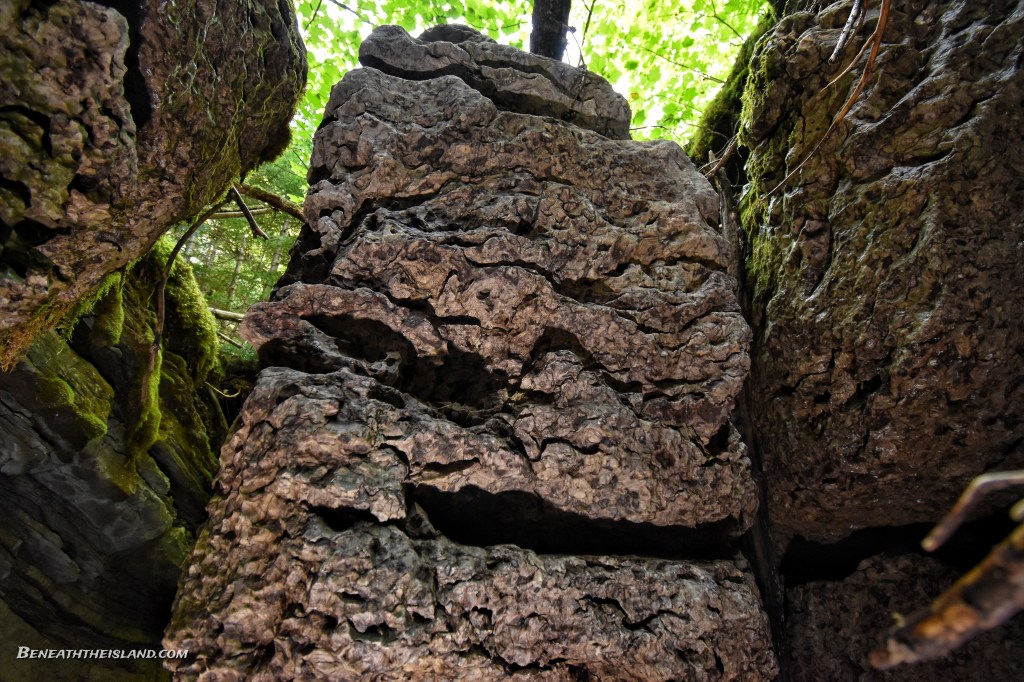 The day was still young, so I went to find another cave in the Arsenault et al. report, called Lost Brook Cave, This took some bushwhacking, as the trail was completely gone and grown-over. It doesn’t look like it gets too many visitors, which is probably a really good thing. This cave seems to be more of a karst window than a cave, but there are definitely sections that are dark. There is an active stream and many different types of limestone meeting at this point, which likely contributed to it’s formation.