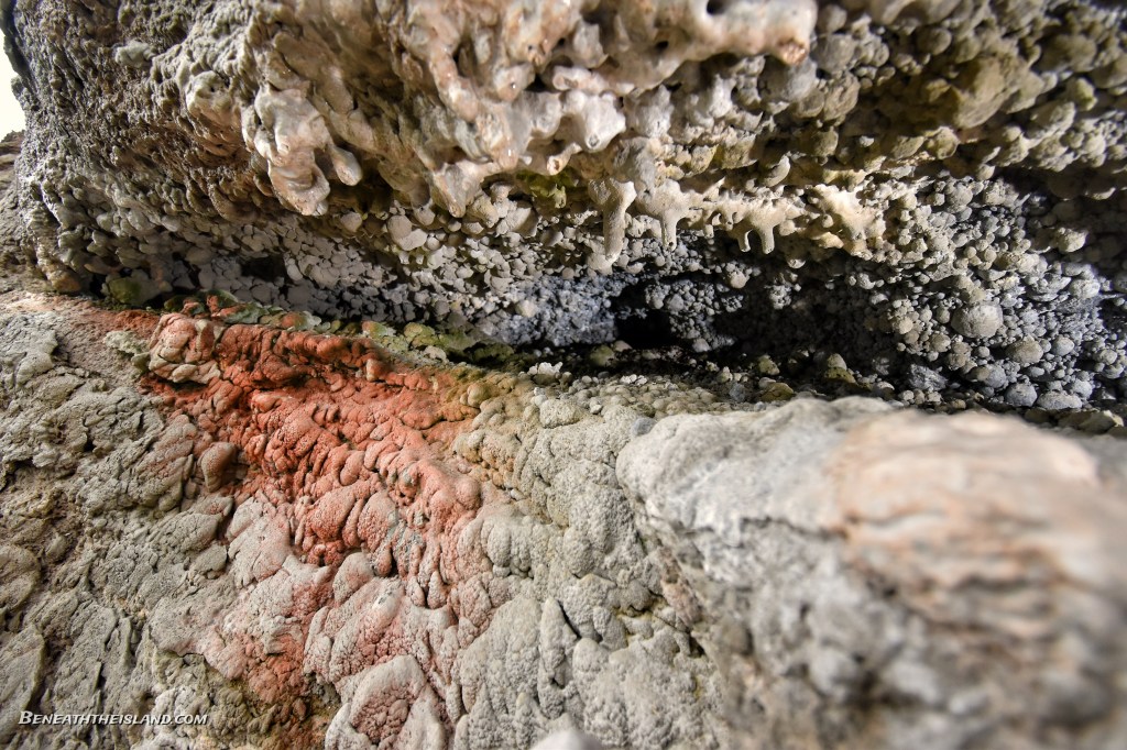 I decided to see if anything has changed over the years. Driving by the first thing I noticed was a cave entrance on a hill above where Archie’s Hole is supposed to be. Inside, I found the most interesting limestone I have ever seen. Conglomerate of small perfectly round limestone rocks held together with beautiful, mostly red calcite formations.