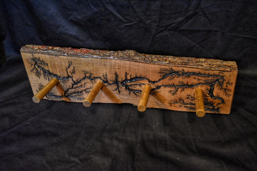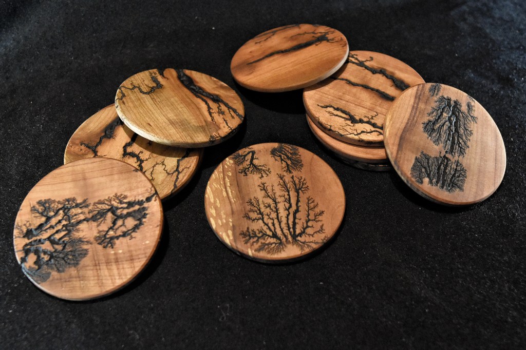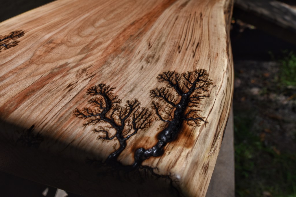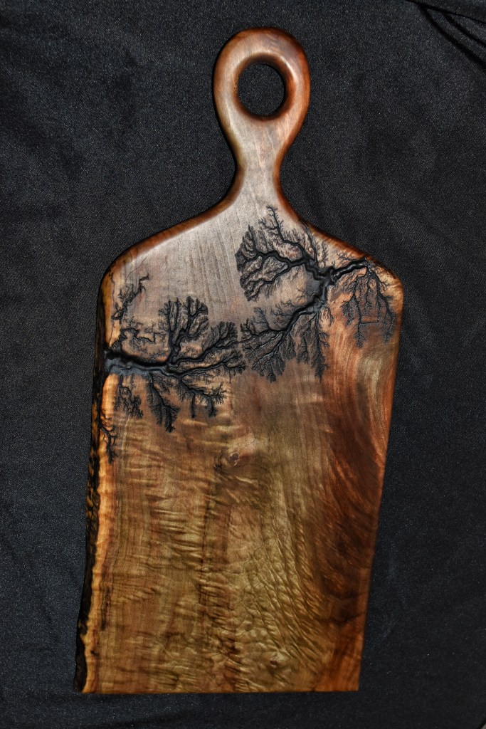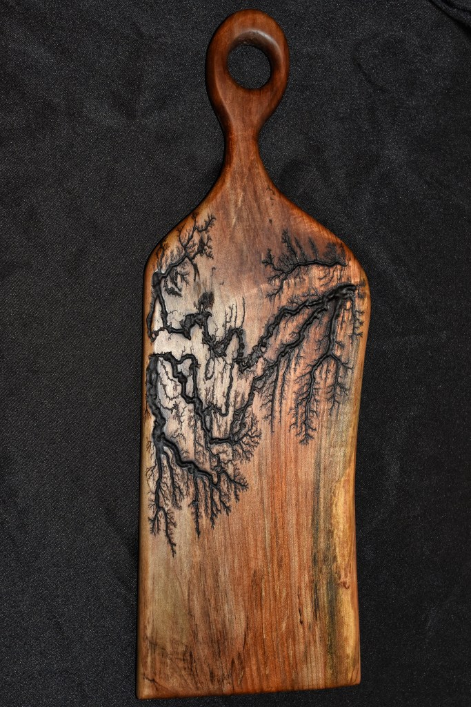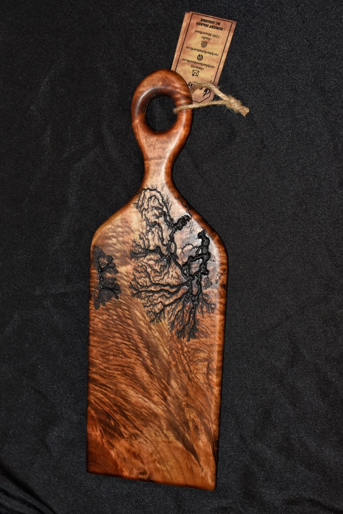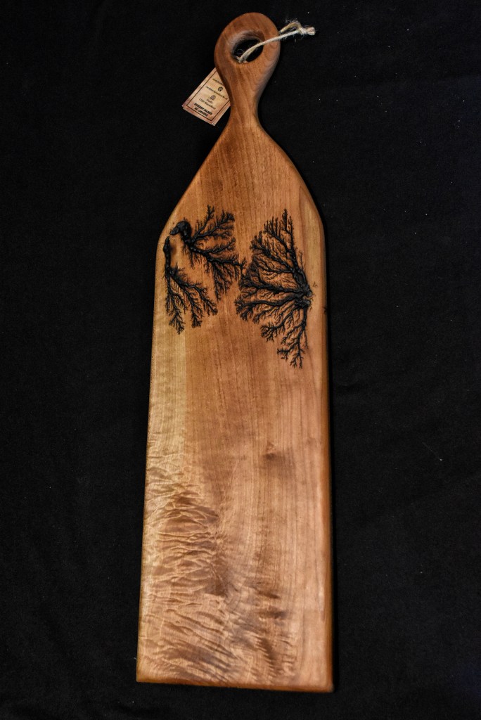 Along with our wooden utensils and cutting boards, we also specialize in Lichtenberg art — a process that uses high-voltage electricity to burn unique fractal patterns into wood.